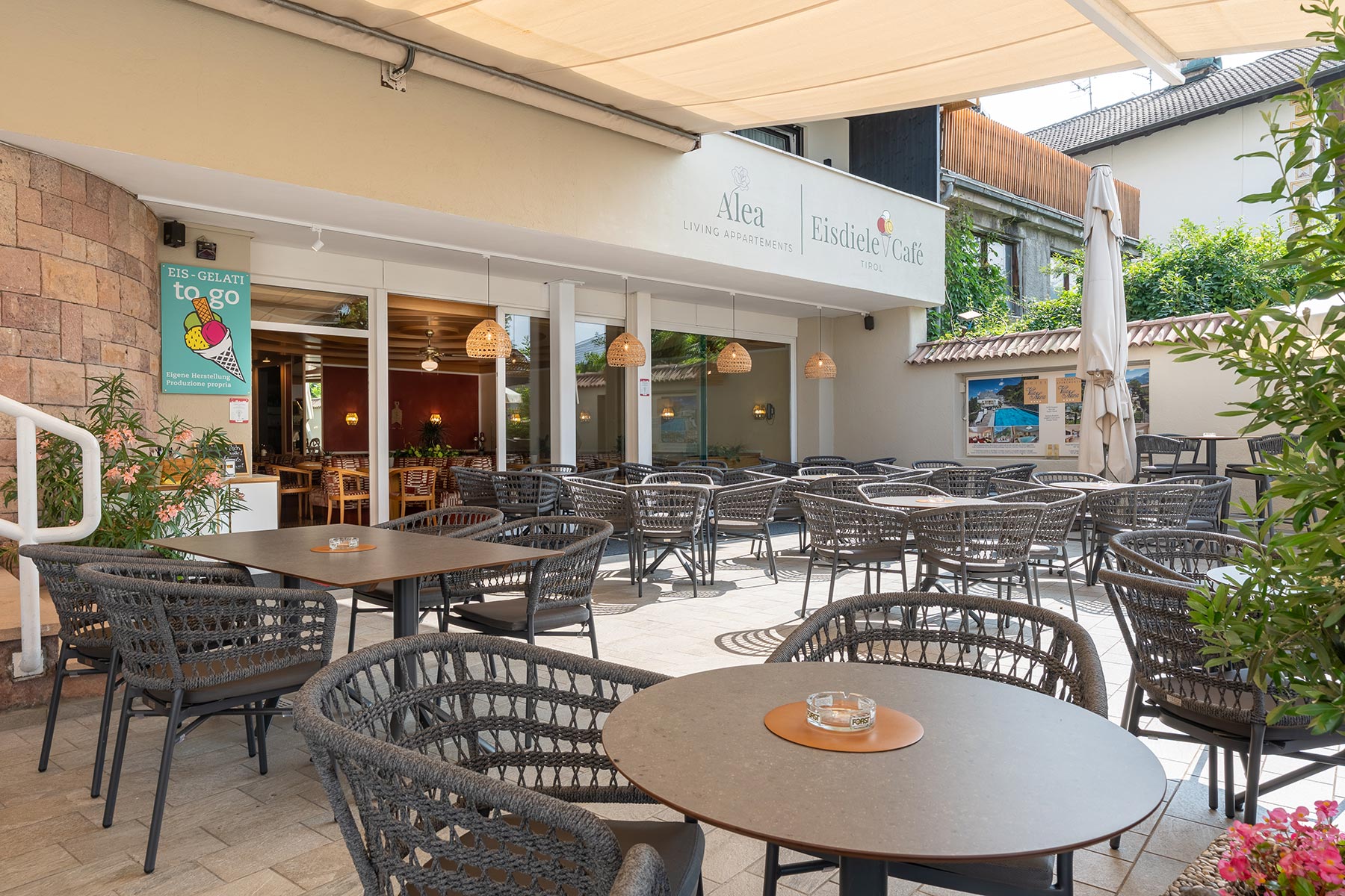 Nel piano terra della casa si trova il Cafe Eisdiele Tirol, che funge anche da gelateria e punto di incontro per gli abitanti del luogo e gli ospiti. Come ospiti dei nostri appartamenti, qui potrete godervi numerosi vantaggi: iniziate la giornata in modo rilassato con una colazione italiana (cappuccino, brioches e spremuta), concedetevi un gelato fatto in casa durante il giorno o lasciate che la sera si concluda con un aperitivo sulla terrazza.
